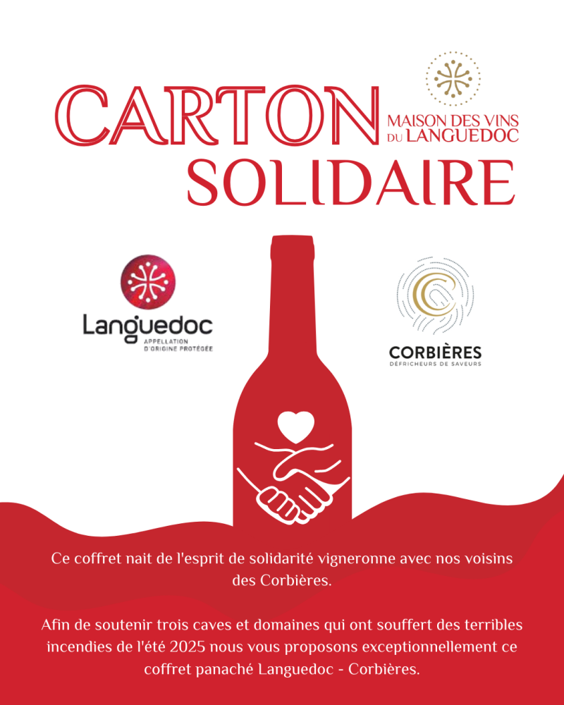 Afin de soutenir trois caves et domaines qui ont souffert des terribles incendies de l'été 2025 nous vous proposons exceptionnellement ce coffret panaché Languedoc - Corbières.